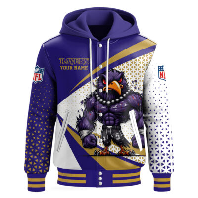 Categories: Baltimore Ravens, NFL, Premium NFL Fan Cave Hooded Baseball Jacket