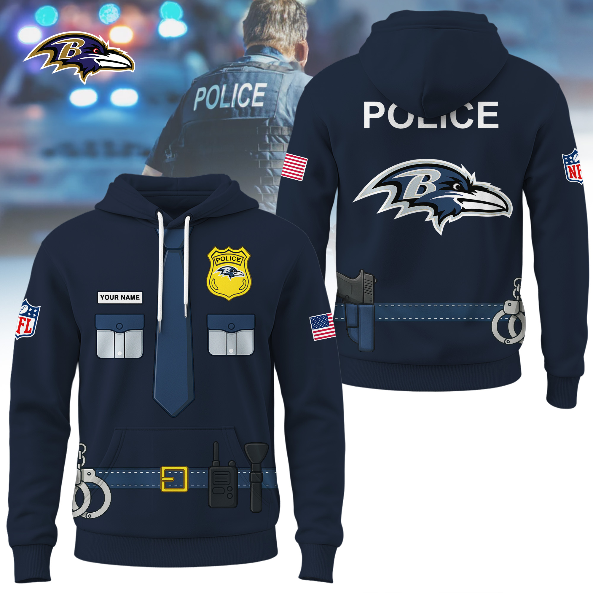 - This item: Baltimore Ravens | Premium NFL Police Costume 3D Hoodie$27.95 – $49.95Price range: $27.95 through $49.95