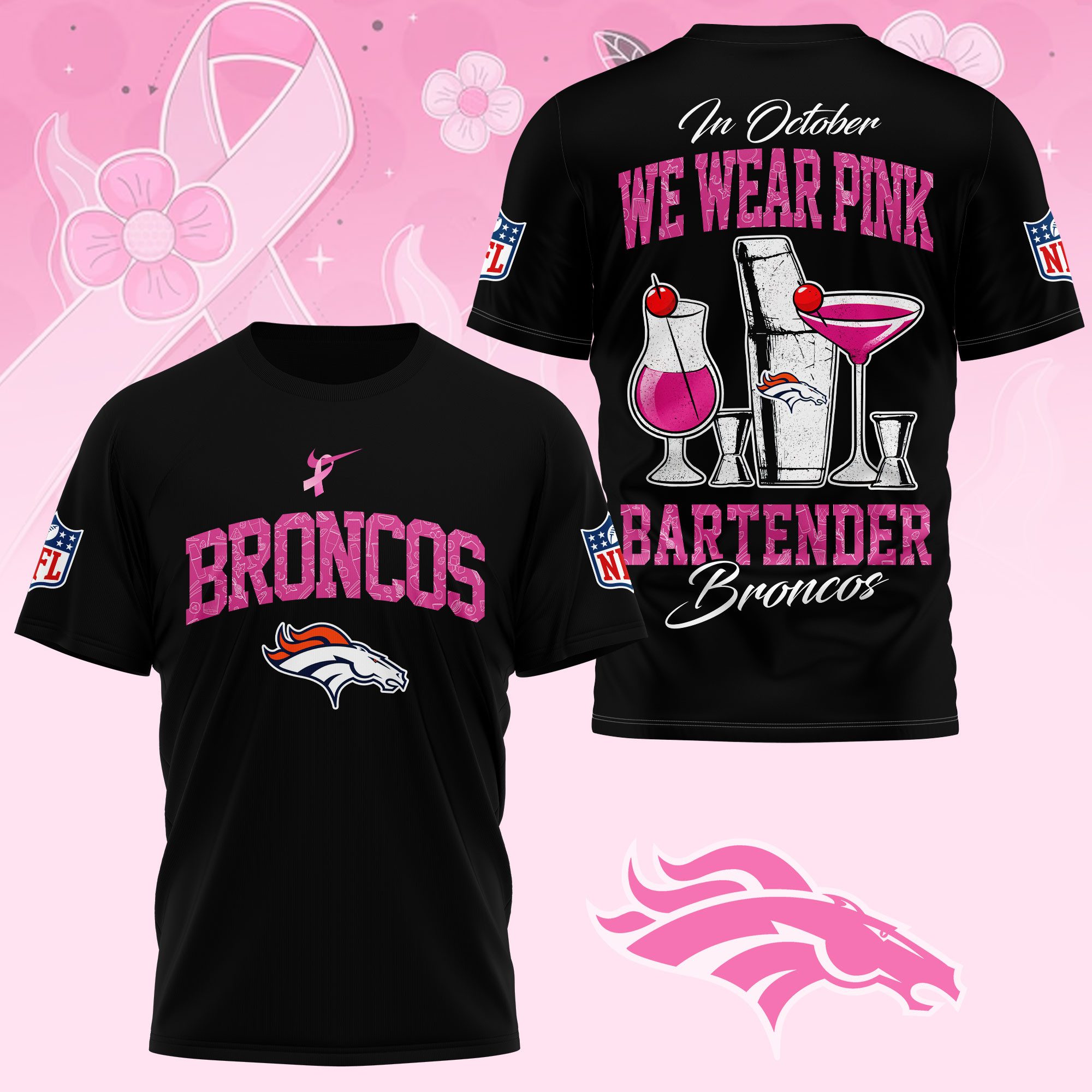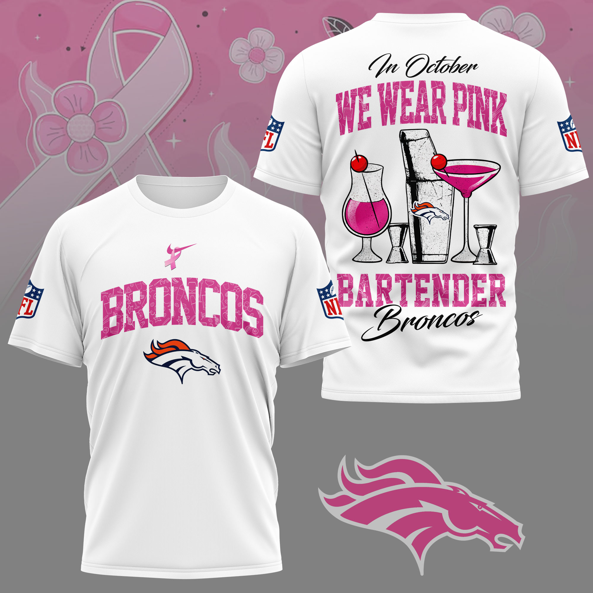 Denver Broncos |Premium NFL Bartender October Breast Cancer Awareness 3D Shirt