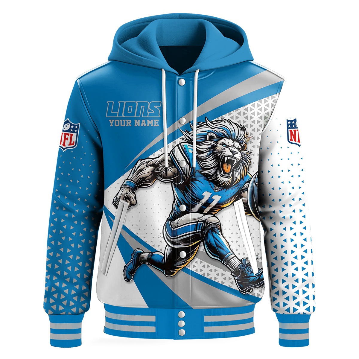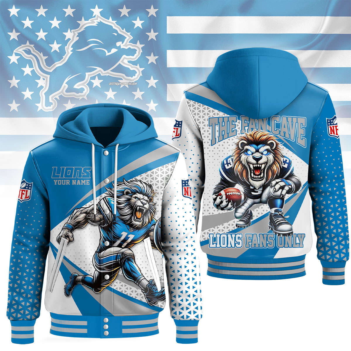 Categories: Detroit Lions, NFL, Premium NFL Fan Cave Hooded Baseball Jacket