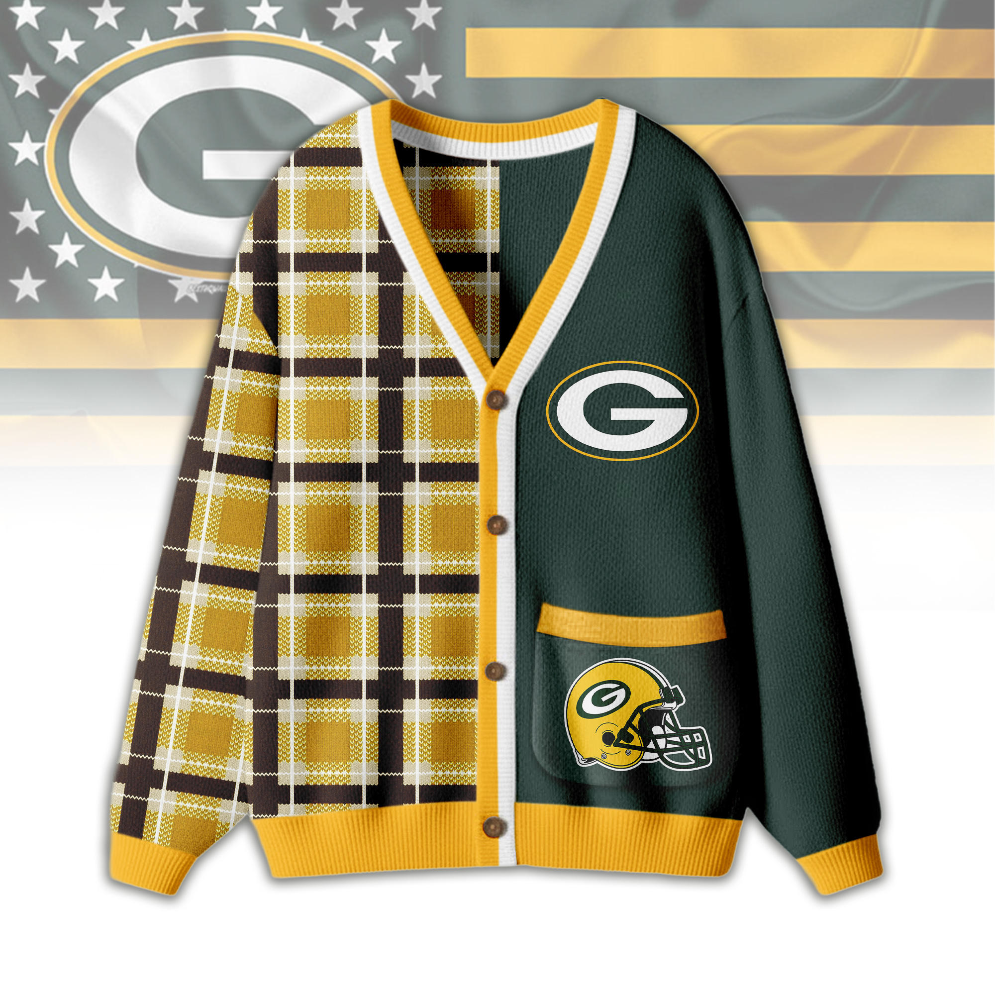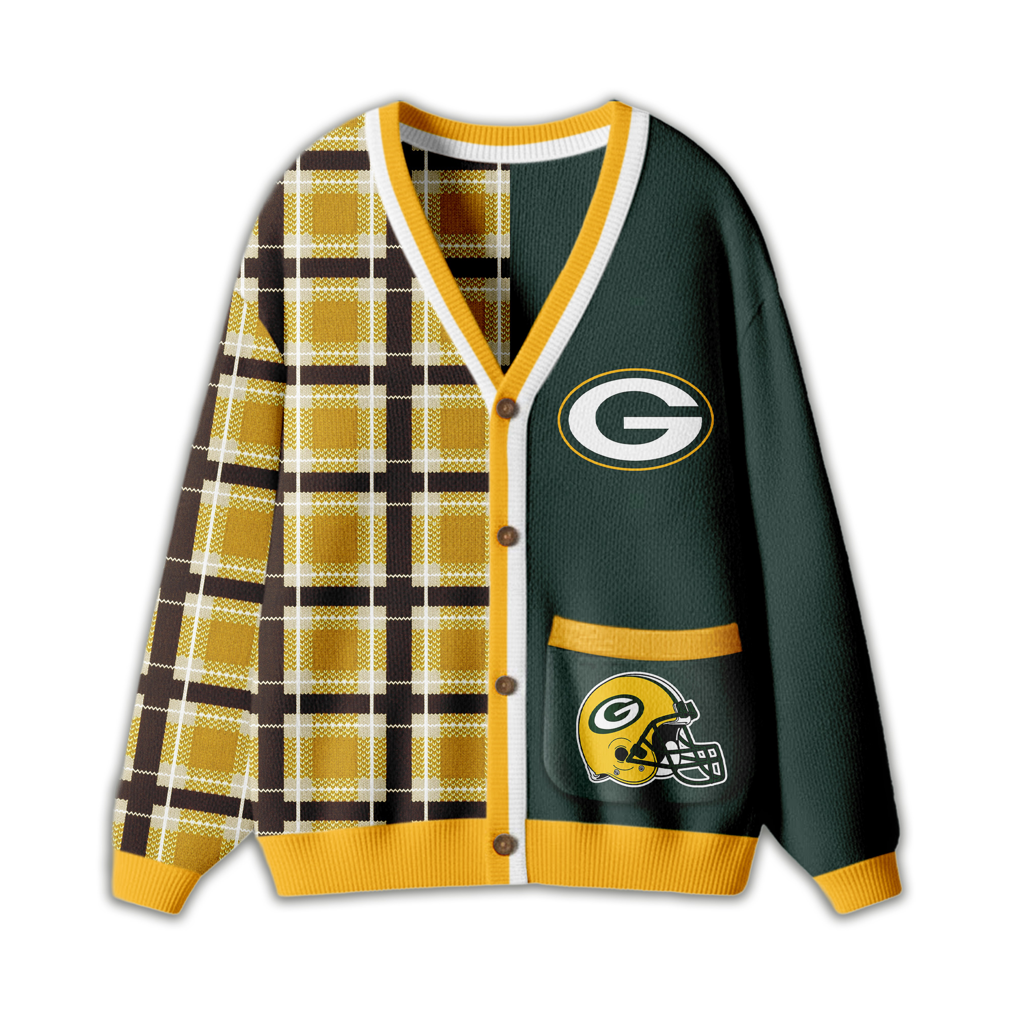 Categories: Green Bay Packers, NFL, Premium NFL Game Day Patchwork Cardigan with Printed Pocket Design TD