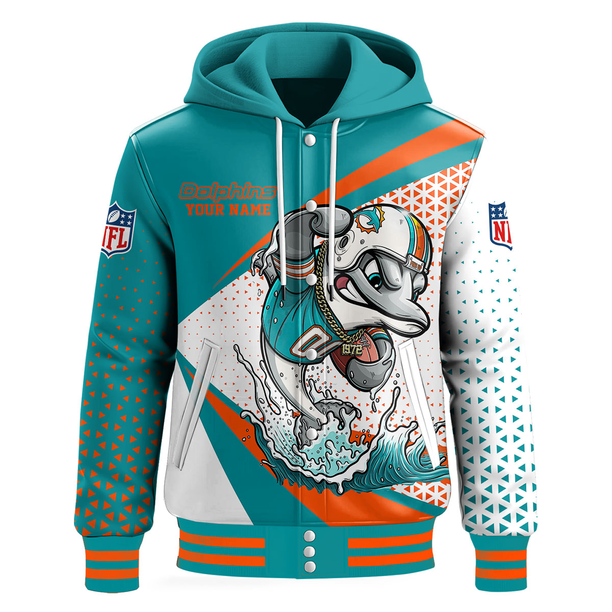 Categories: Miami Dolphins, NFL, Premium NFL Fan Cave Hooded Baseball Jacket