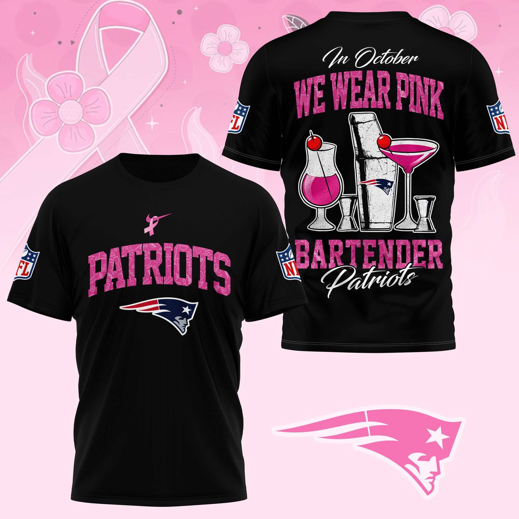 New England Patriots |Premium NFL Bartender October Breast Cancer Awareness 3D Shirt