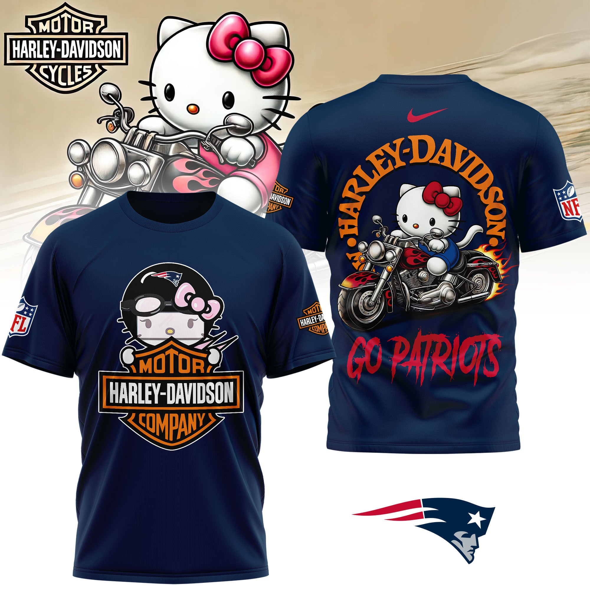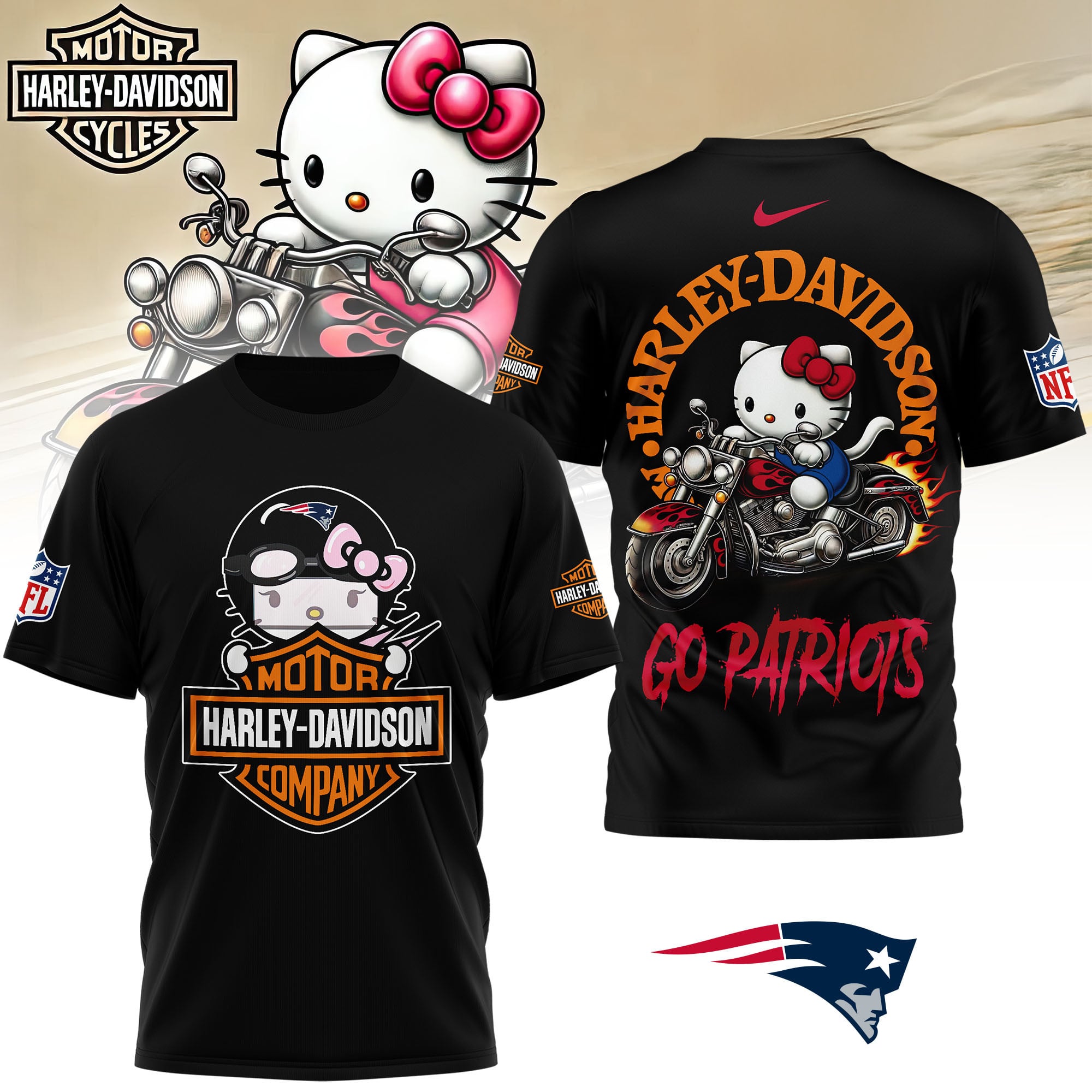 New England Patriots | Premium NFL Hello Kitty Harley Davidson 3D Shirt