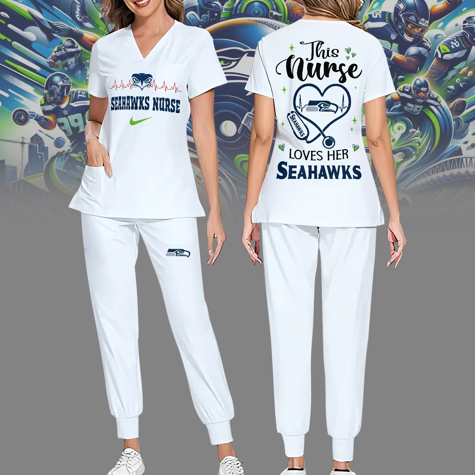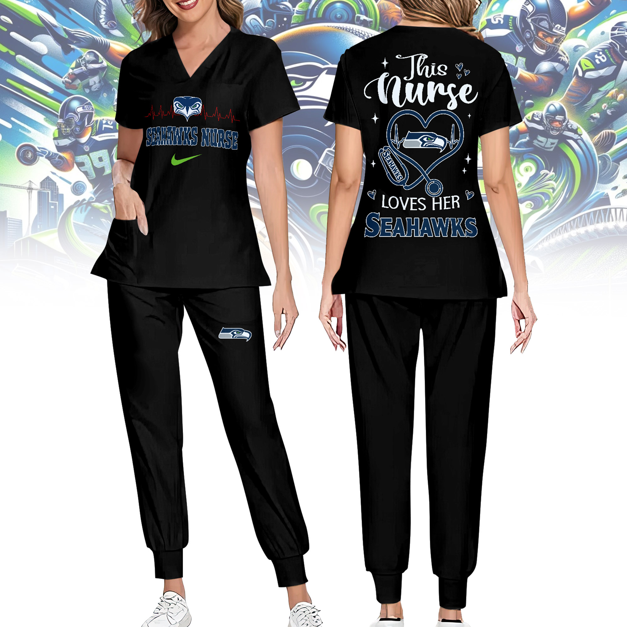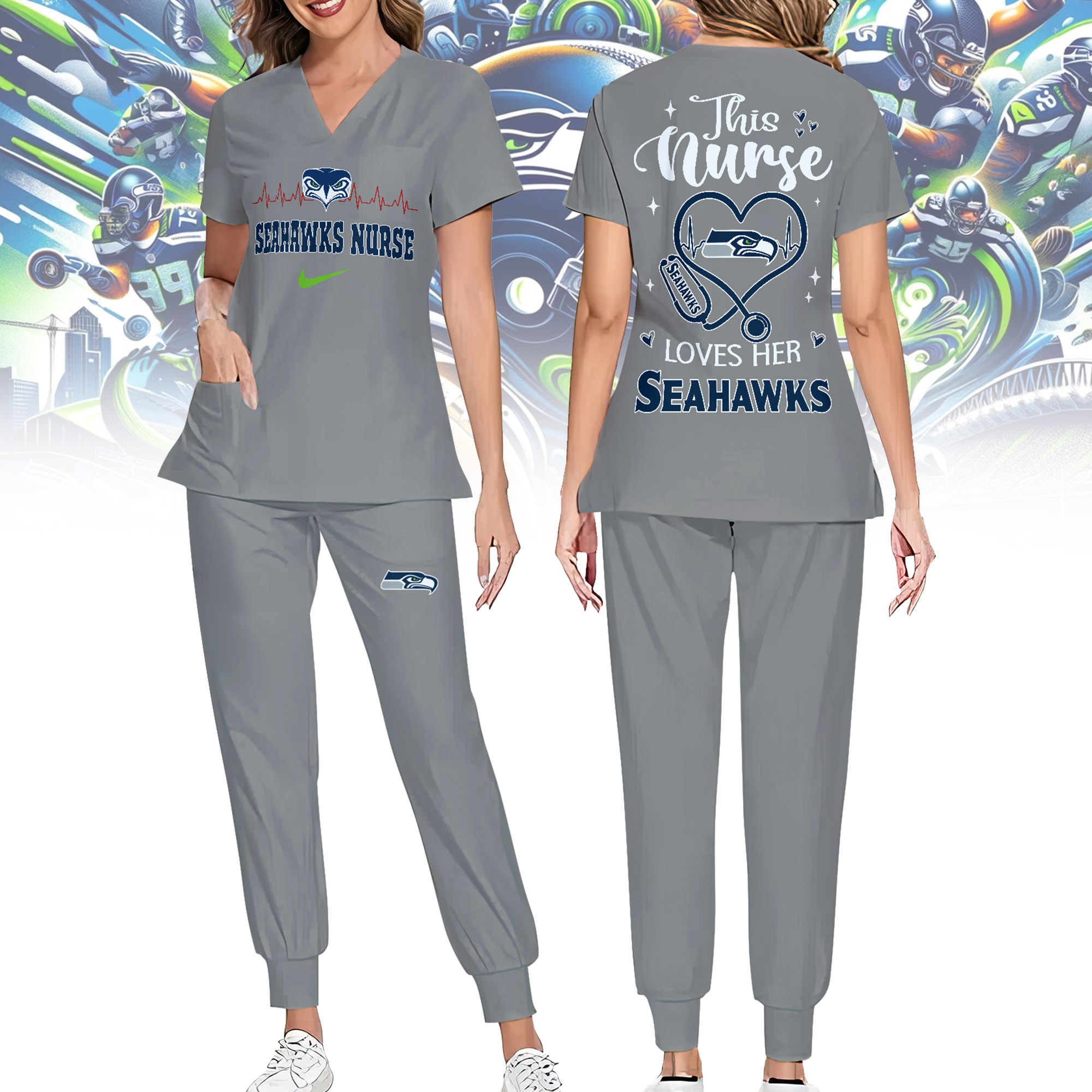 Seattle Seahawks | Premium NFL Nurse Appreciation Stretch V-Neck Scrub Top And Jogger Pant