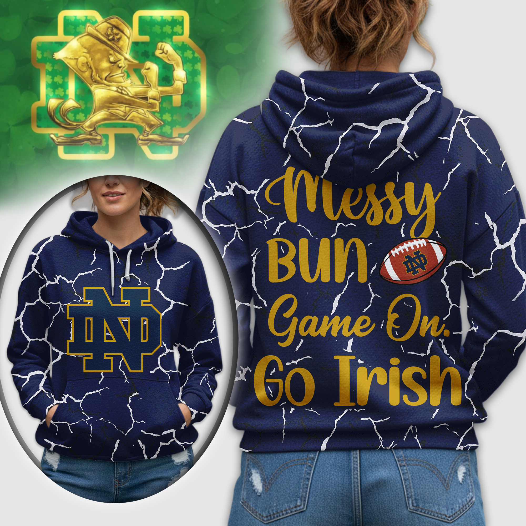 Notre Dame Fighting Irish | Premium NCAA Messy Bun Game On 3D Hoodie