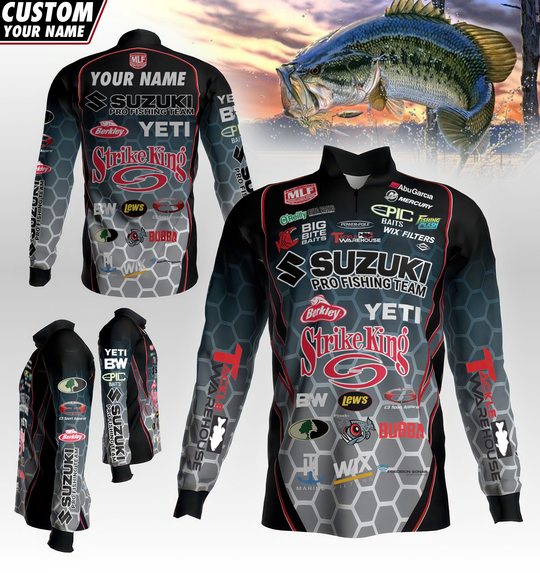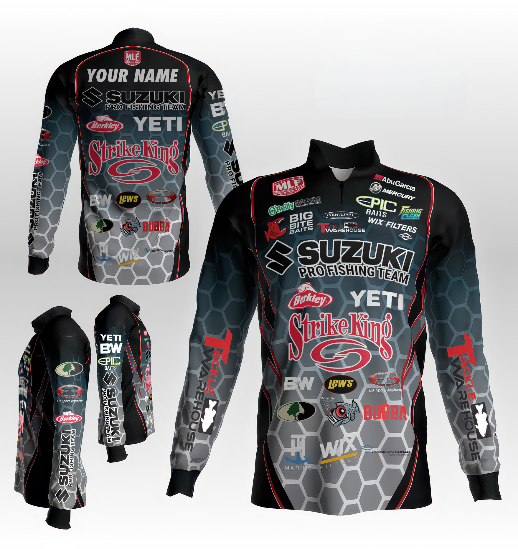 Design: Dynamic pro-fishing style with full sponsor graphics, featuring a 1/4 front zipper and long sleeves for optimal comfort and mobility.