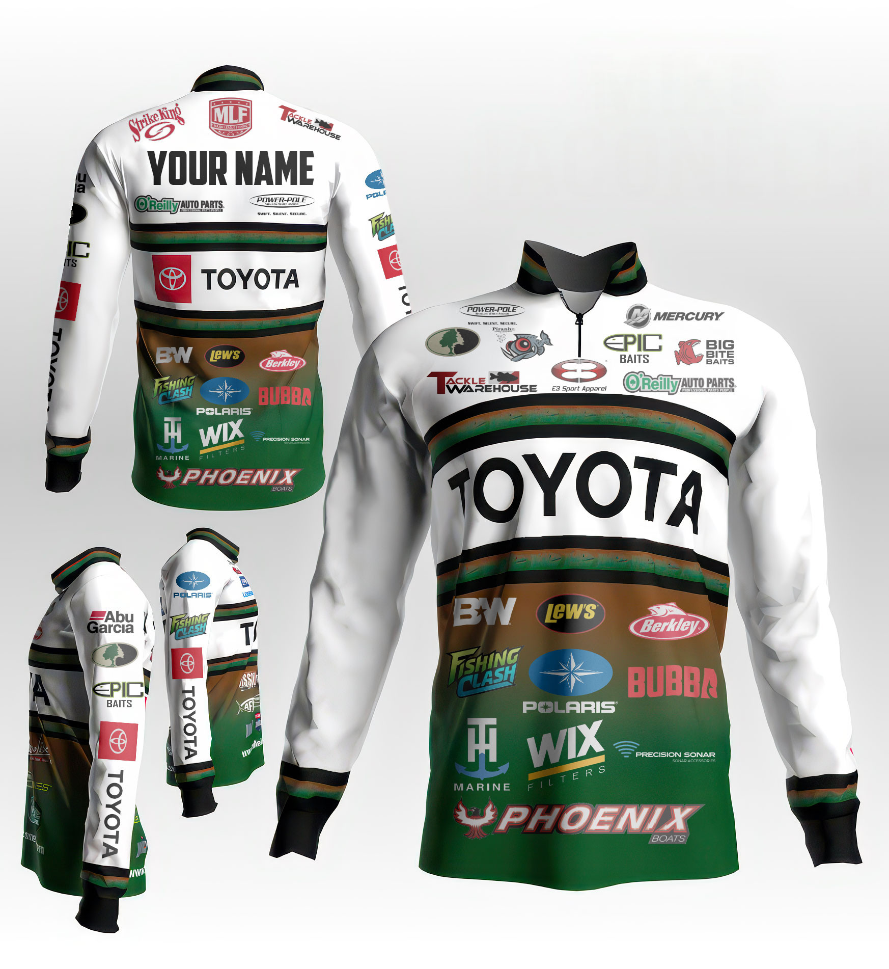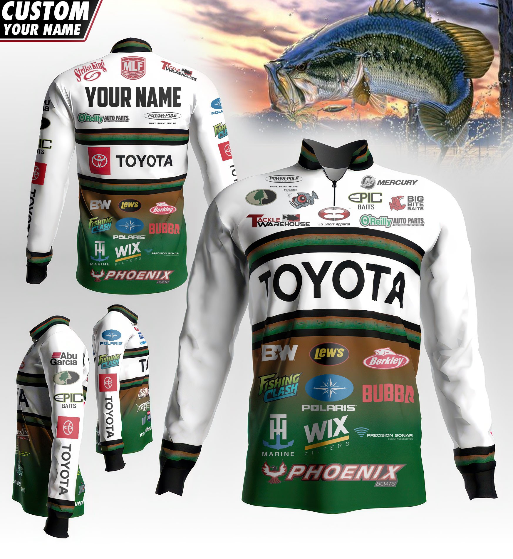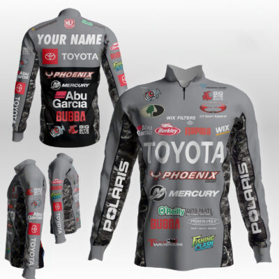 Design: Dynamic pro-fishing style with full sponsor graphics, featuring a 1/4 front zipper and long sleeves for optimal comfort and mobility.