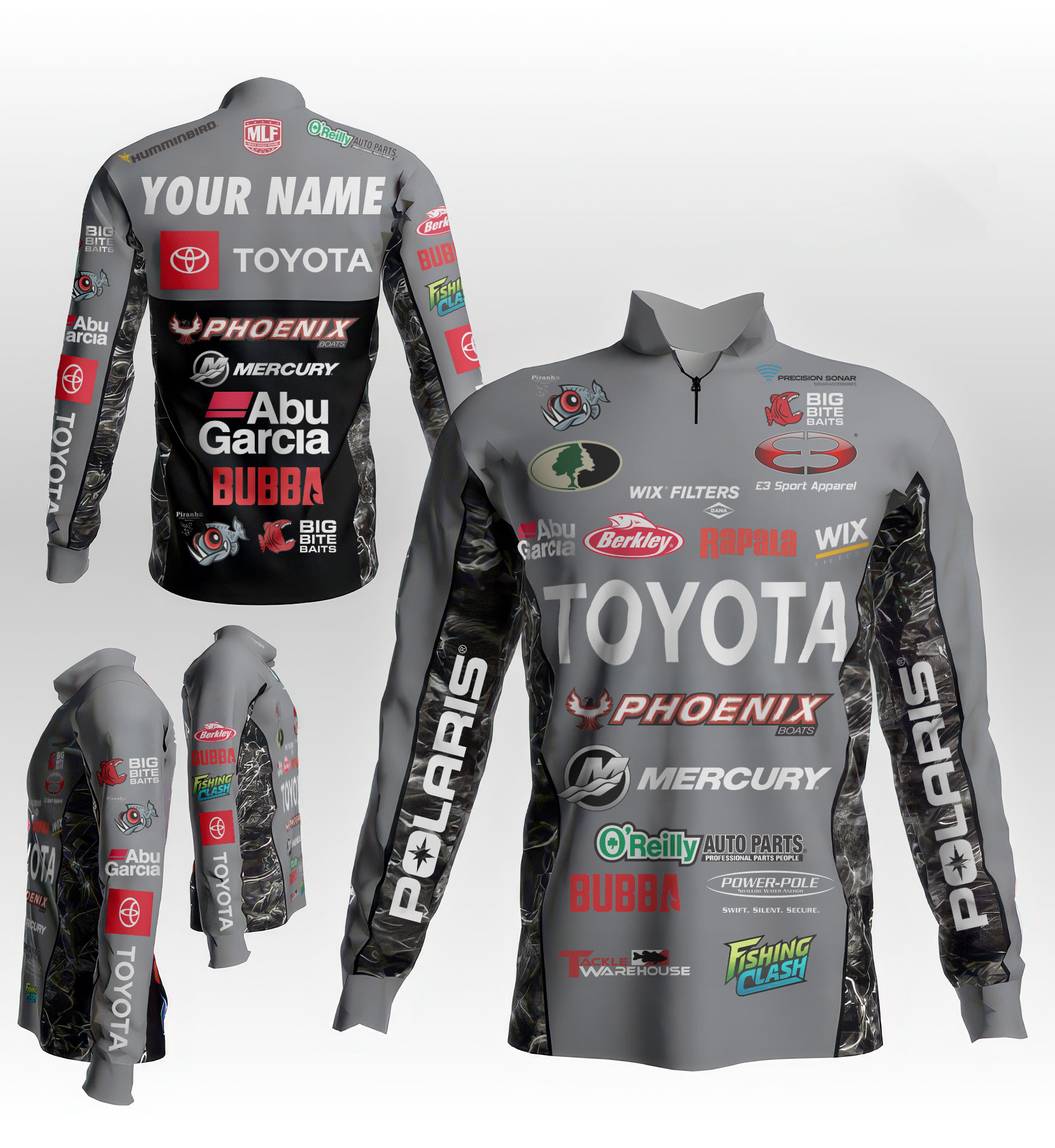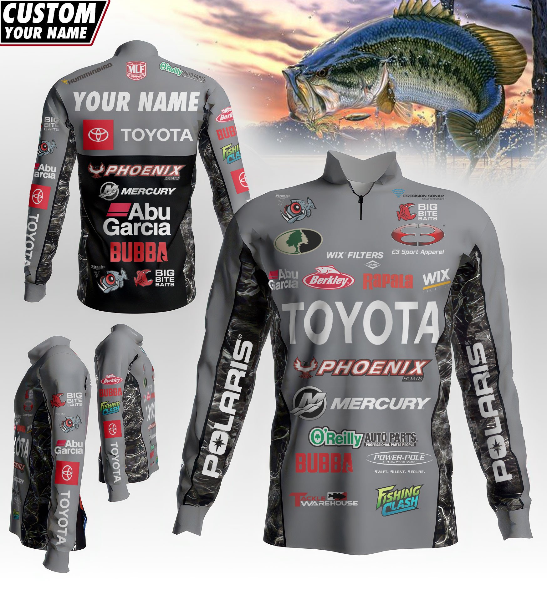 Design: Dynamic pro-fishing style with full sponsor graphics, featuring a 1/4 front zipper and long sleeves for optimal comfort and mobility.